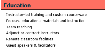 We can help with other educational services that support the entire range of training and documentation needs. State-of-the-art training has become an absolute necessity if today's companies are to remain competitive in their chosen markets. Many companies with training organization responsible for educating employees often like to bring in contract instructors to deliver education is areas of expertise not found within the company, or to give people exposure to fresh ideas. Often, this can be a very affordable alternative to hiring someone with the desired background. Goals of lifelong learning have proven to increase productivity and quality. We are all in a constant learning mode and want to work for companies that foster education. |